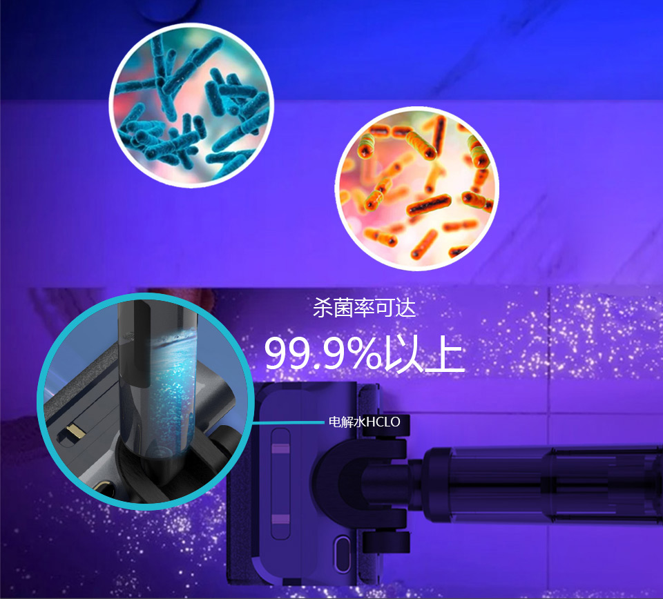 全新產(chǎn)品自帶電解水功能,可將清水點解成HCLO,殺菌率可達99.9%以上。無需添加其他消毒劑,方便環(huán)保清潔、自潔效果雙倍提升。